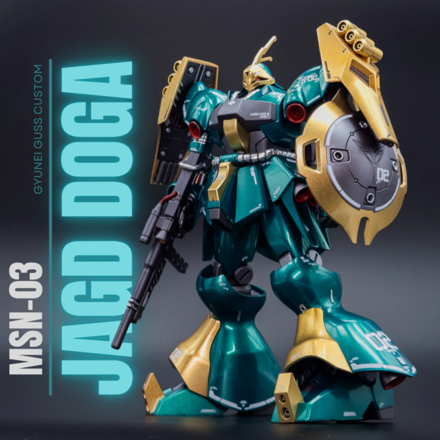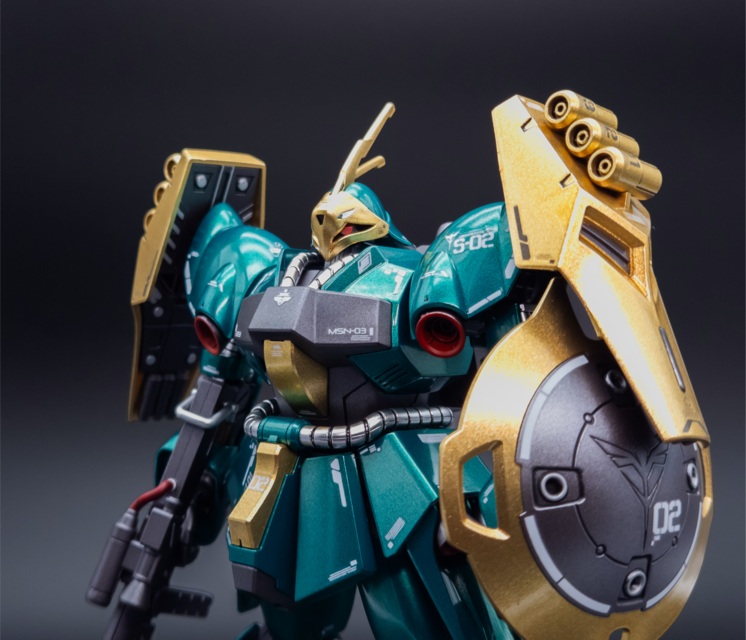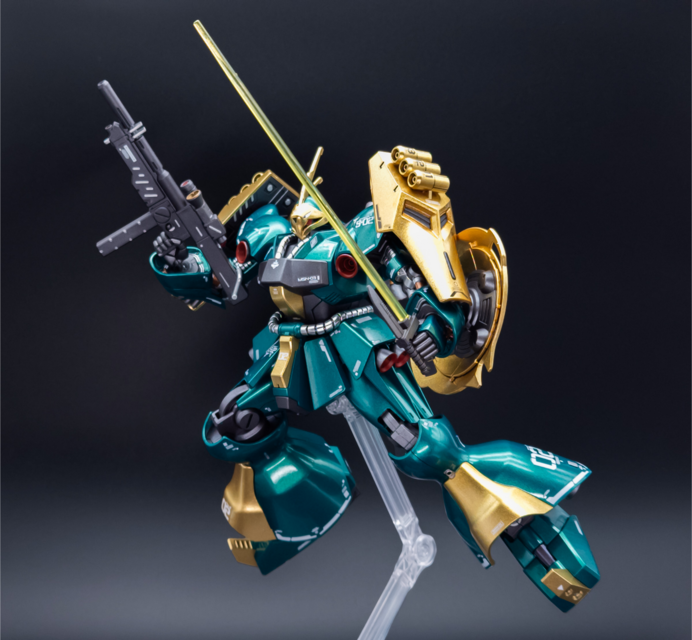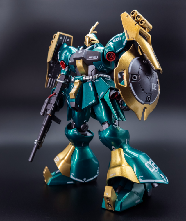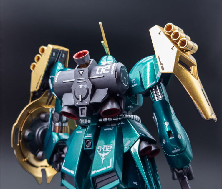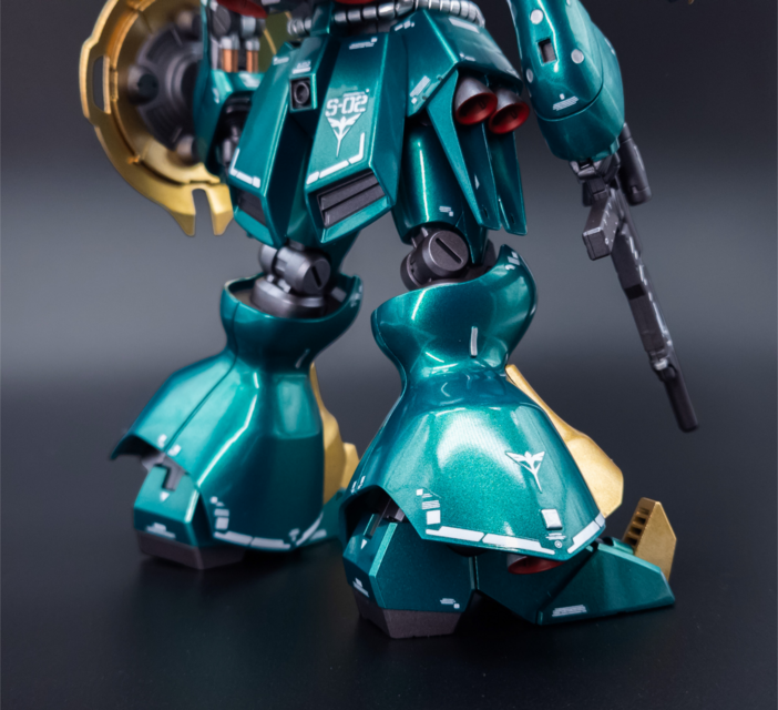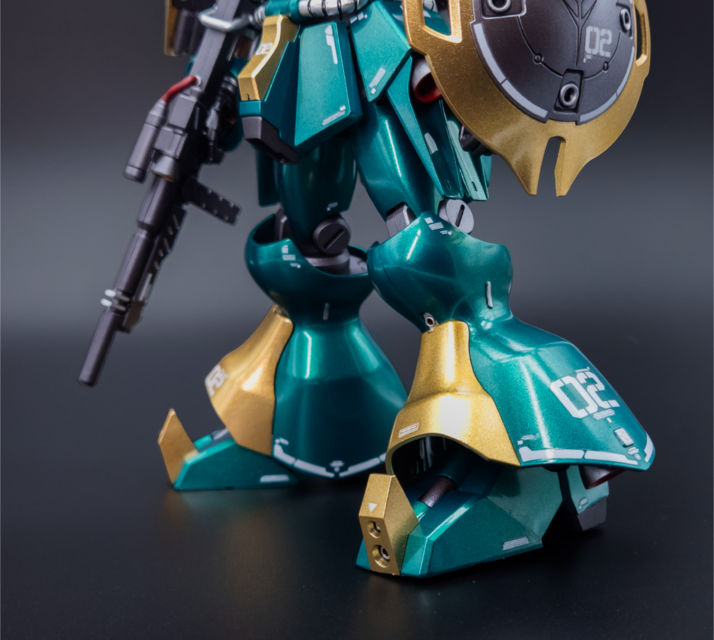 For this one, I wanted to paint the kit top to bottom and go all out. It turned out well! I went with Mr Color Metallic Green and Mr Color GX Rough Gold for the main colour scheme. I also used Tamiya Sparkling Silver for the hose details. Then, I did many layers of gloss to make the metallic paint pop. For the inner frame, I painted it Tamiya Gunmetal, then panel lined and flat coated. I also used Tamiya Light Gunmetal here and there to add colour separation. I decided to match the Bandai colour scheme fairly close since I really like the bare colours, I just wanted to enhance them a bit. I was hoping for the green to look a bit more blue but I’m still happy with the result.
