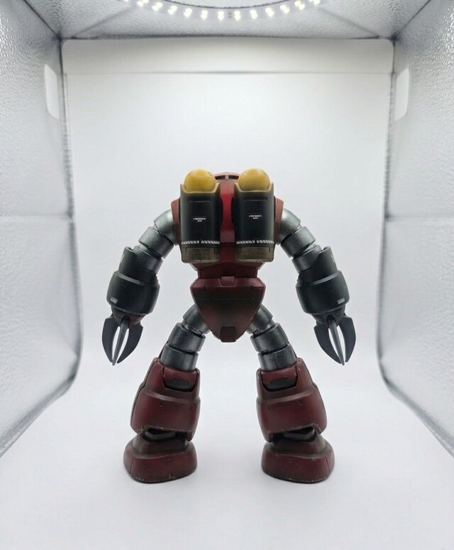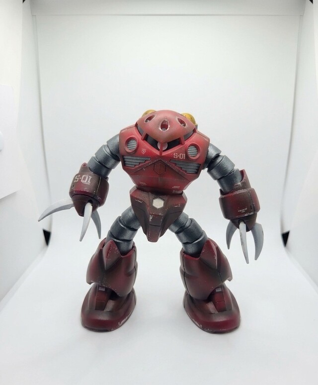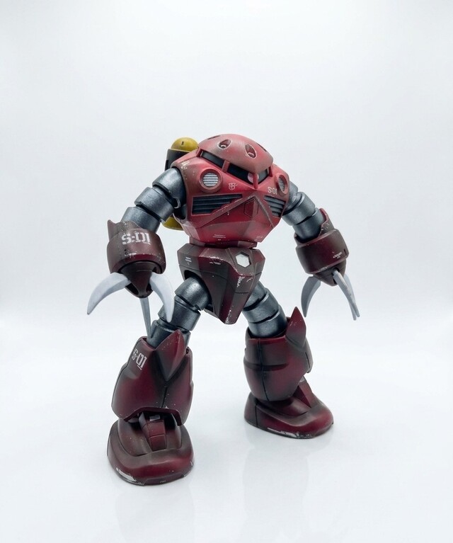 I wanted to practice my preshading, and used both Naphthol Red and Quinacridone Red. I wanted to use the darker red towards the edges with the brighter red in the center. I also stuck some decals I had from the Sazabi into it. Since this mobile suit was used in the Battle of Jaburo and swims in the water, I wanted to try some edge chipping with silver off a sponge. I think it came out okay, and less is definitely more here