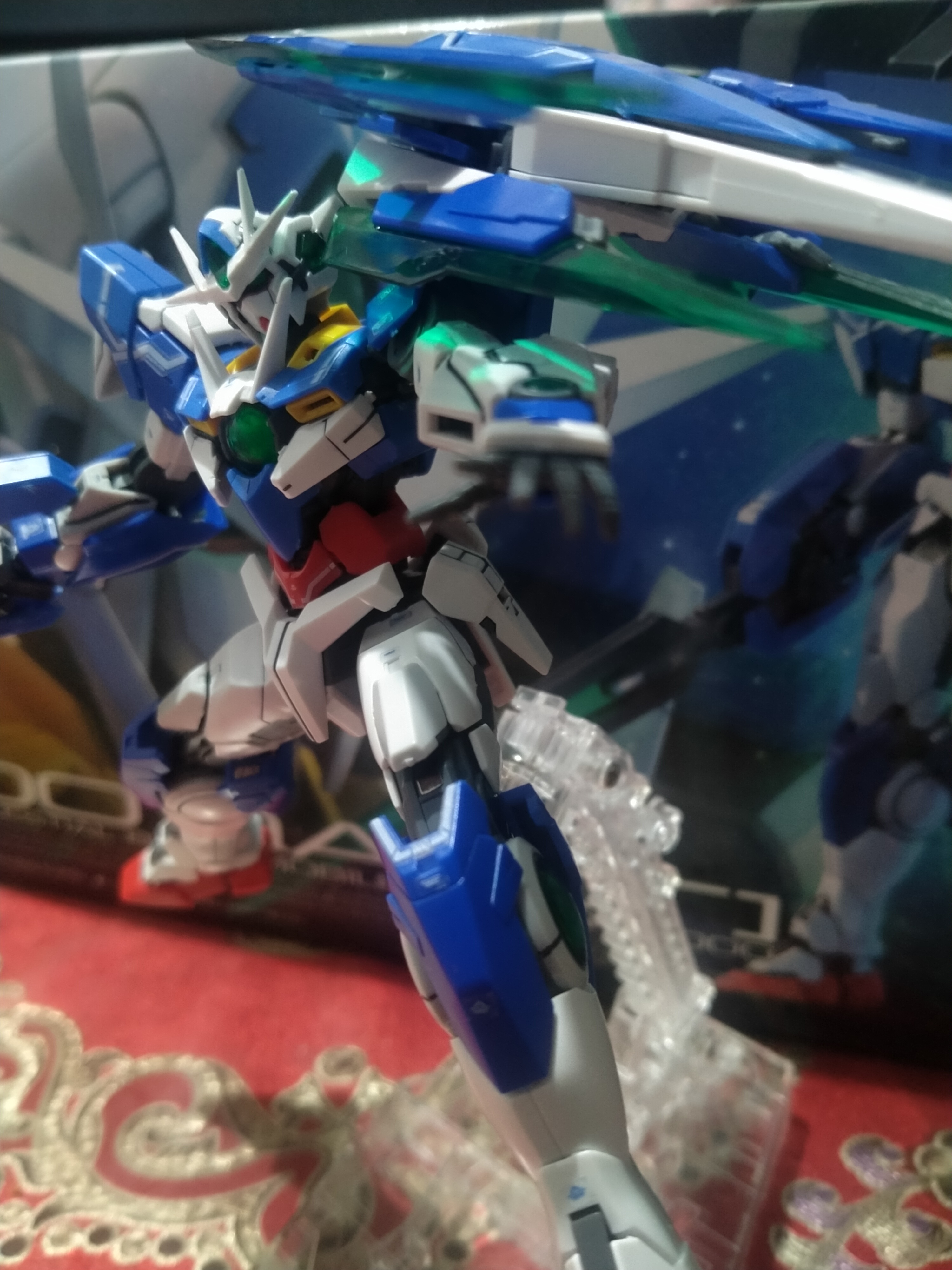 Includes clear adjustable stand for GN Sword V in buster rifle mode and Setsuna F. Seiei figurine.