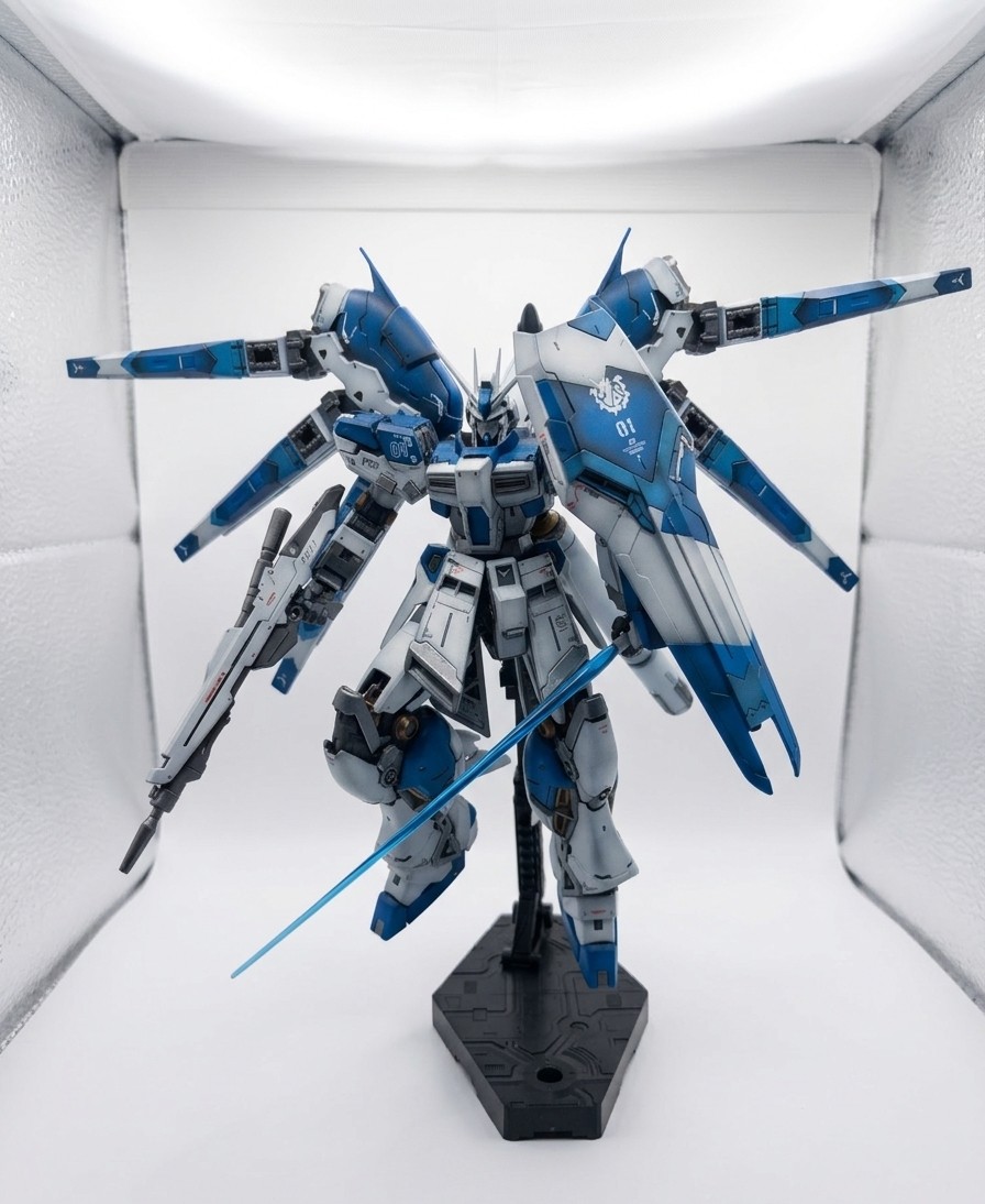 Uses the B and E plate runners of RG-32. Hyper Mega Bazooka Launcher and Fin Funnel effect parts are sold separately as P-Bandai exclusive accessory kits.