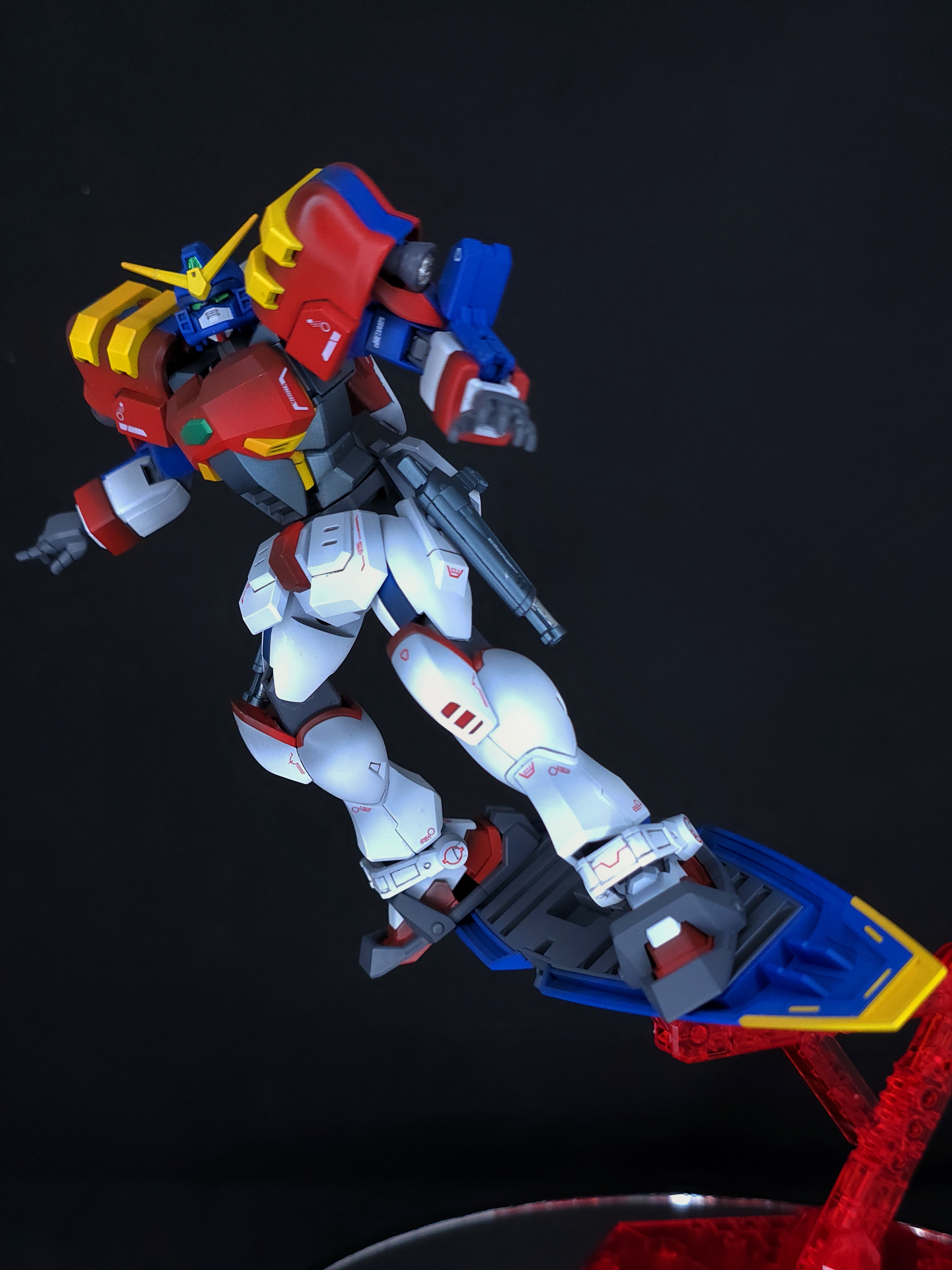 P-Bandai exclusive release. Uses the B plate runner of HGBF Gundam Rose. Includes transformable Core Lander, leg clamps for Flyer Shield, clear red Action Base 5 with support stands for armor explosion pose, and effect part for Burning Punch.