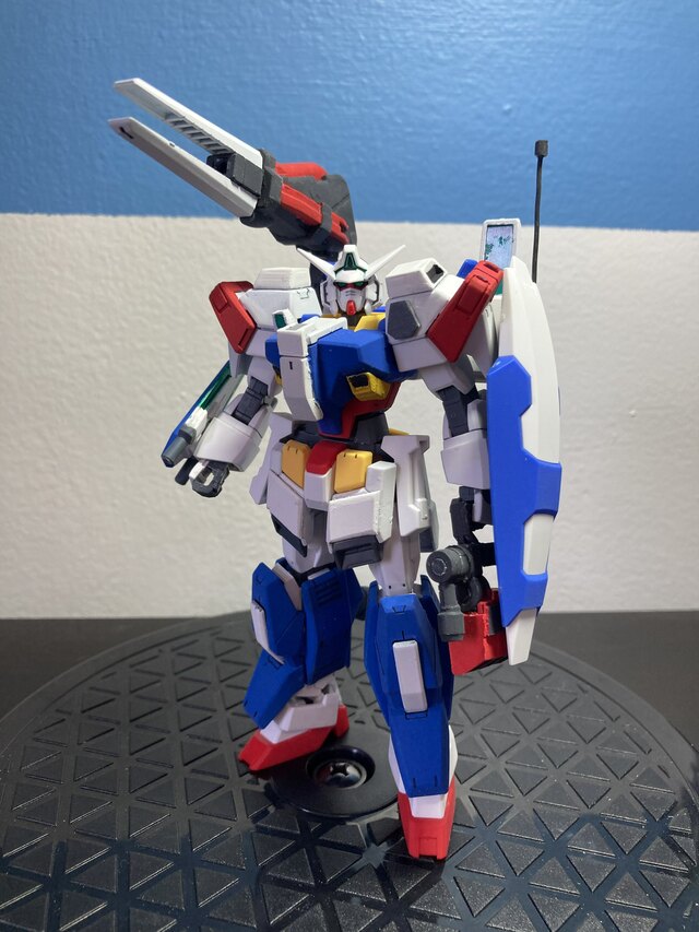 The model kit itself is based on the Gundam The Origin Zaku II, which received numerous scratchbuilt additions. The head has been given a clear part for the monoeye (making it barely visible in certain lighting), and a custom scratchbuilt fin which is made in separate halves so that the top and bottom halves of the head are still able to separate in need be. The Powered GM shield was actually made using a HGUC Gundam Revive’s shield, sanding the surface (including the cross symbol) flat with a strip of plaplate laid over the top to serve as the ridge on the center of the shield. The main inspiration for the colors on this build were the EFSF Zaku II F2’s tan, and the EFSF Hizack’s dark blue. The main reason this was made as an EFSF-captured unit is due to the lack of parts to turn it into a true Zaku II [Stutzer], notably the Gelgoog’s beam rifle in place of the RX-78-2’s and a third Zaku forearm in place of the Powered GM’s.