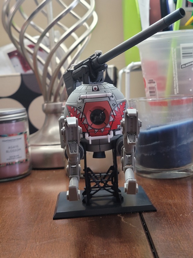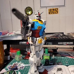 This is my Perfect Grade Unleashed Rx-78. I painted the entire kit except for the RG style molded frame parts at the base, I was worried about lacquer paint makng it brittle. I used G-Paint metallic paints on the frame (Dark Silver, Bright Silver, Copper and Pale Gold). The armor is painted in Mr Color Off-white, G-paint red, Mr Color Rx-78 Anime Red as well the their Anime Blue and Anime Yellow. I ran into a problem doing the matte top coat on the outer piece of the shield. Some kind of contamination hot in between the gloss coat and paint and it melted when the matte coat went on. After sanding it down and running it through my ultrasonic cleaner to remover the damaged paint, I ended up with a bunch off tiny holes. When I finish repairing the parts I’ll paint it up and add it back to the model. The kit still looks great without it tho!