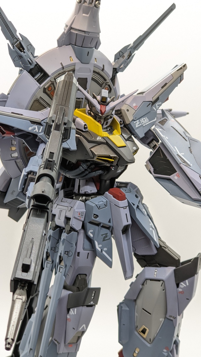 First time airbrushing, scribing, waterslides and adding plaplate. Custom panel lines can be seen on the ankle armor, along with plaplate additions to the top of shoulders and front of ankle armor and an extended gun barrel. Paints used are: Gaia Cobalt Violet+ German Grey, Gaia German Grey, Gaia Mandarin Orange, Tamiya German Grey, Tamiya Copper, Tamiya Dark Iron