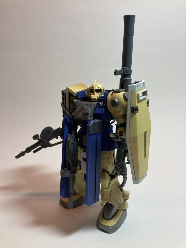 Used a hg origin C6 zaku as the base, swapped head to a fz fritz type. Used a system weapon 09 bazooka. Painted with tamiya metallics and mr gundam color sg06/07 for the greens. May have went a but too heavy with the twmiya smoke but not a bad overall result.