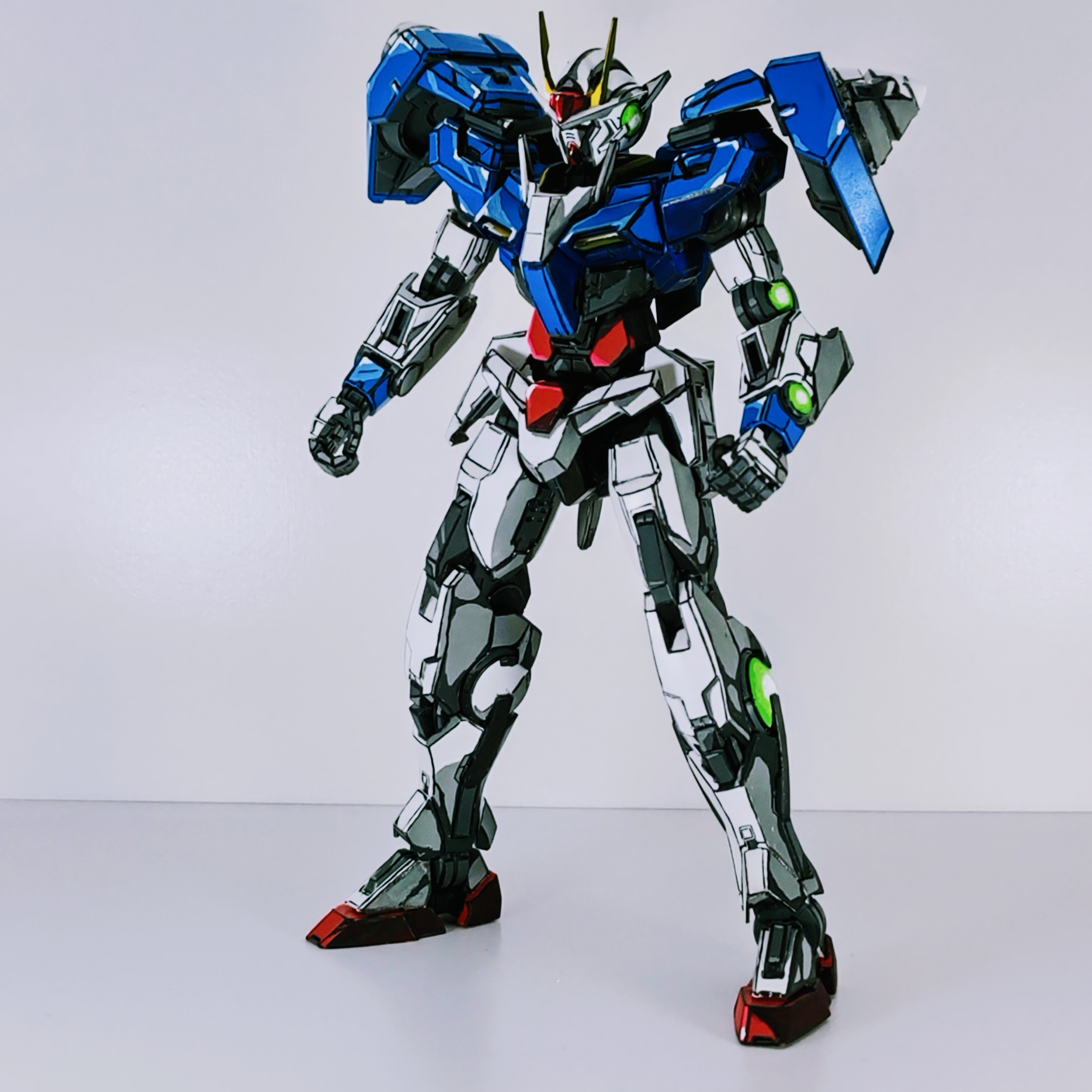 Includes Setsuna F. Seiei (civilian outfit) and Saji Crossroad figurines, one Gunpla LED Unit Green, and GN Condensers to create GN-0000RE+GNR-010 00 Raiser GN Condenser Type. Chest, GN Drives/Condensers, and O Raiser binders accommodate five Gunpla LED Units (sold separately). Reissues from 2023 onwards are molded in Ecopla, which is plastic recycled from materials discarded during the production of regular Gunpla.