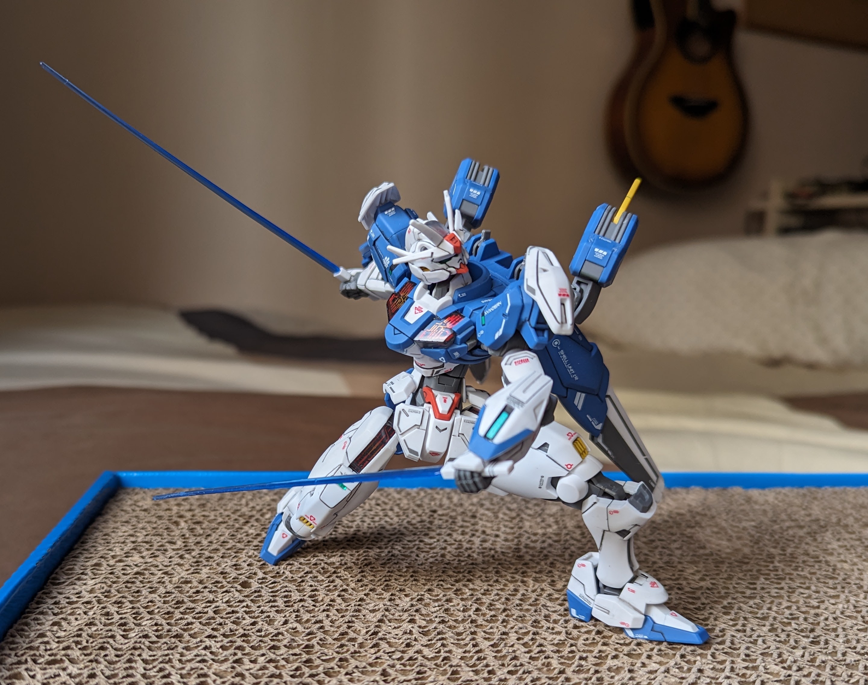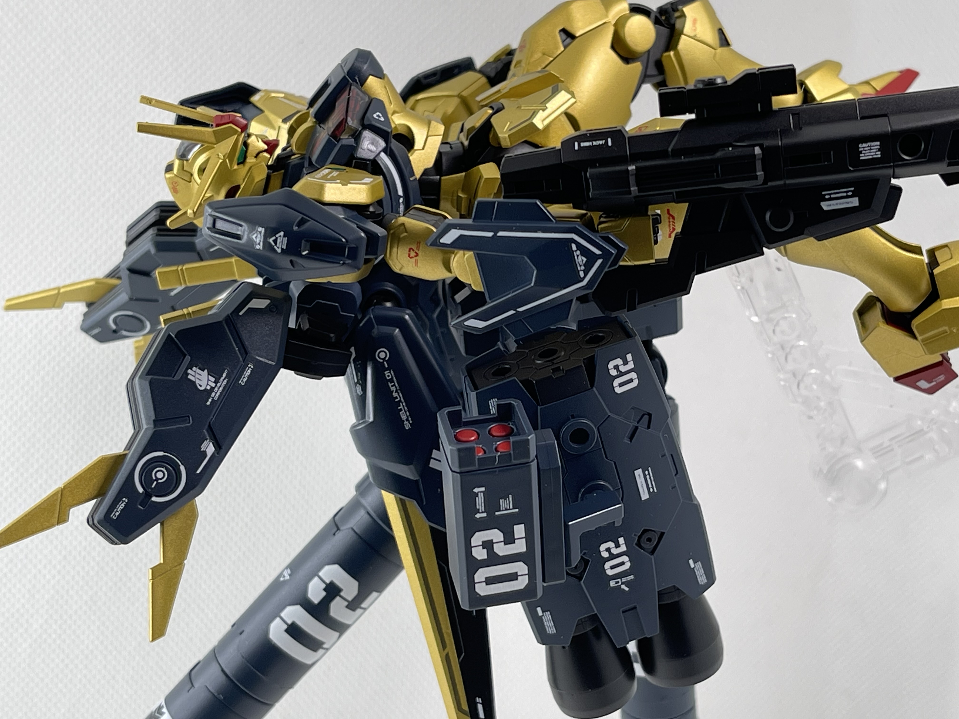 Features pre-printed effects on clear chest parts. Modelers have the option to have the Shell Unit parts displayed as active or inactive using the foil sticker sheet. Beam Rifle transforms into GUND-BIT Cannon via parts-swapping.